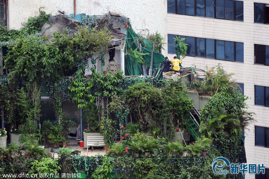 透过被拆除部分,其掩盖下的搭建露出了“冰山一角”。20楼处是一个20平方米左右的露天平台,摆放着两把白色塑料长椅与一把欧式木质长椅。平台西侧有一间暗房,门口的小花坛种有颜色鲜艳的花卉;平台东侧是一个旋转台阶,通往搭建在21楼位置的玻璃温室,在台阶边缘与温室内,仍可以看到多株植物。