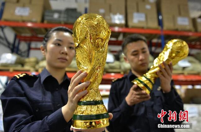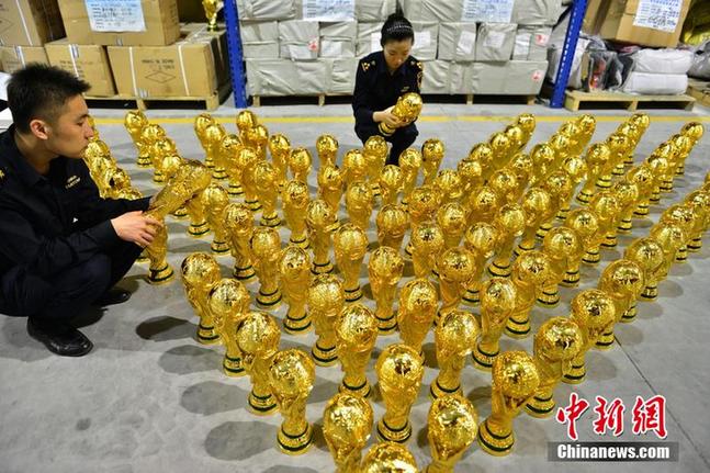 巴西世界杯开赛在即,市场上体育用品侵权的情况也逐渐增多。2014年4月16日下午,浙江义乌海关对最近查获的1020尊未获得国际足联授权的“大力神杯”进行清点暂扣。经权利人确认,侵犯了世界杯知识产权,已依法立案。原来这是义乌海关在对一票出口至利比亚、申报品名为“树脂奖杯、纸制纪念卡”的货物依法进行开箱查验时发现的。据了解,这是今年浙江省内海关部门查获的一批数量较大的假冒“大力神杯”。义乌海关工作人员介绍,海关总署4月份已部署“绿茵行动”加大世界杯知识产权保护力度。行动开展以来,义乌海关紧紧抓住义乌国际商贸城“小商品出口”这个主渠道,以深入国际商贸城作政策宣讲、邀请商户代表参观保护成果、请国际足联的权利人代表为商户现场授课等形式多样的活动。坚持‘打击’和‘引导’并重,努力构筑保护小商品知识产权的钢铁长城。图为浙江义乌海关对最近查获的1020尊未获得国际足联授权的“大力神杯”进行清点。吕斌 摄 图片来源:东方IC