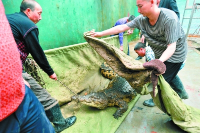 4月14日上午,汉口中山公园鳄鱼园内,驯鳄师将温室里冬眠的22条鳄鱼转场,用套脖子、捆嘴巴、蒙眼睛、抬担架等方法,忙了2个多小时才将它们一一送进室外观赏园。这批鳄鱼去年10月中旬起冬眠了半年。这些鳄鱼全是尼罗鳄,最重的有500多斤。
