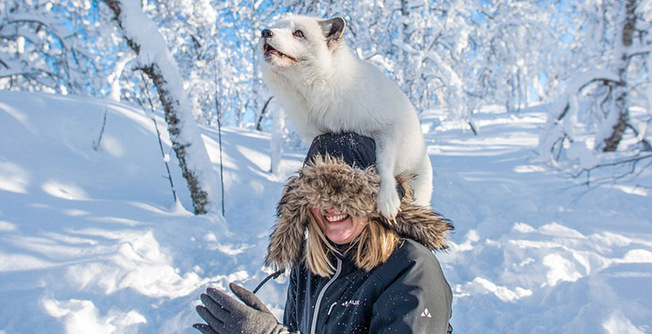 在帕尔的在照片中可以看到,一只热情异常的狐狸爬上帕尔的朋友琳恩(Lene Kvandal)的头顶,因为镜头外饲养员斯蒂格(Stig Sletten)在琳恩的头顶上方晃动着食物。帕尔说道,“那天气温有零下22度,但是天气晴朗,斯蒂格手上拿着食物引起了这只北极狐的注意,然后慢慢地把食物移动到琳恩的头顶上方,吸引狐狸爬上琳恩的背。这只狐狸最后站在琳恩头上想要够到食物。我们刚开始进入它们的活动范围时觉得既害怕又好奇,但还是努力保持镇静,想着怎么才能用相机更好地记录镜头下的动物们。”