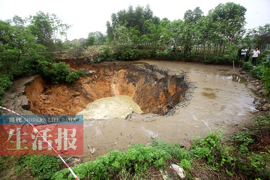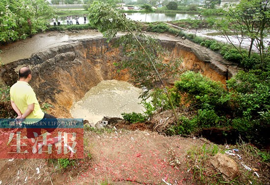 记者在采访中,不时看到塌陷的深坑边上有土块往下滑落,深坑侧面还出现了一个裂缝,隔壁鱼塘的水正从裂缝中流入塌陷的深坑,裂缝有扩大的趋势。有村民告诉记者,原先塌陷的鱼塘并没有这么大,它是一点点扩大的,每隔一阵就有土方塌陷。“快看,又塌了!”正跟记者说话的一位村民惊叫起来,鱼塘边上一堵巨大的泥方轰然倒下。