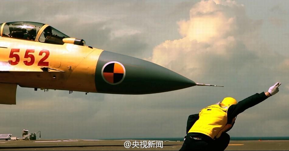 昨天,央视新闻首先在节目中播出这一视频。视频配以恢宏的音乐,记录了歼15舰载机在辽宁舰上起飞、着舰的画面。视频以飞行员的日常基本训练作为开头,描述了飞行员做起飞前的准备工作、飞行中驾驶飞机及着陆的状态。值得注意的是,视频中,还有近10秒时间展示了歼15在空中进行特技飞行动作的画面,飞行员驾驶飞机进行翻转,画面中天空与地面的位置调转。