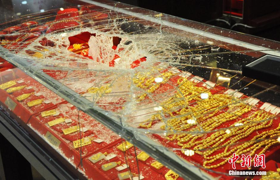 4月25日晚19点50分左右,苏州木渎镇翠坊街恒孚银楼(木渎店)遭遇抢劫。据店员回忆,当时一名头戴帽子和口罩的男子手持小铁锤直接闯入店内,砸碎黄金柜台的玻璃后,抢走一把黄金饰品后迅速逃离,前后不到10秒。当地警方接报后立即赶往现场调查,目前案件还在进一步调查之中。图为事发现场,摆放黄金饰品的柜台被砸碎。中新社发 王小兵 摄