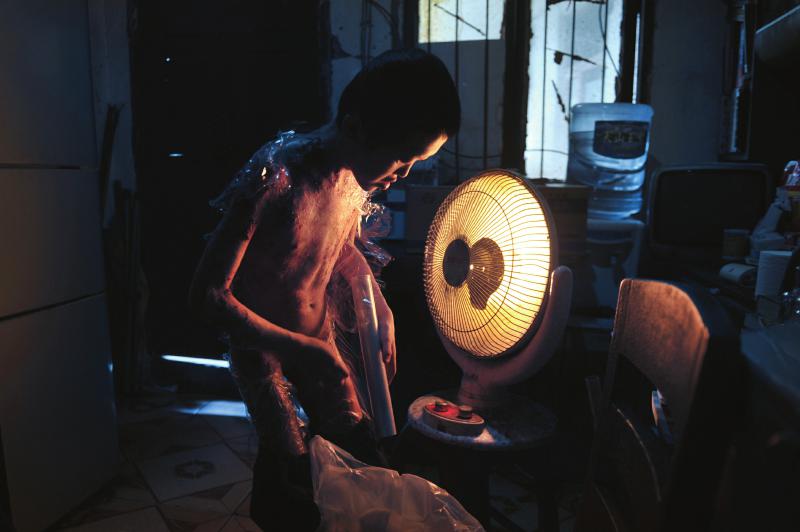 4月28日,小良陈在裹保鲜膜前用取暖器烤身体,是为了让疮口变干,以便包上保鲜膜后舒服点。