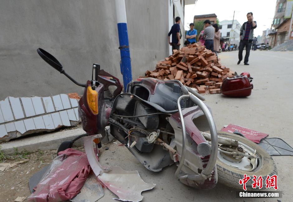 4月28日,福建省福州市闽侯县发生一起恶性驾车撞人事件,图为事发现场被撞毁的摩托车。中新社发 刘可耕 摄