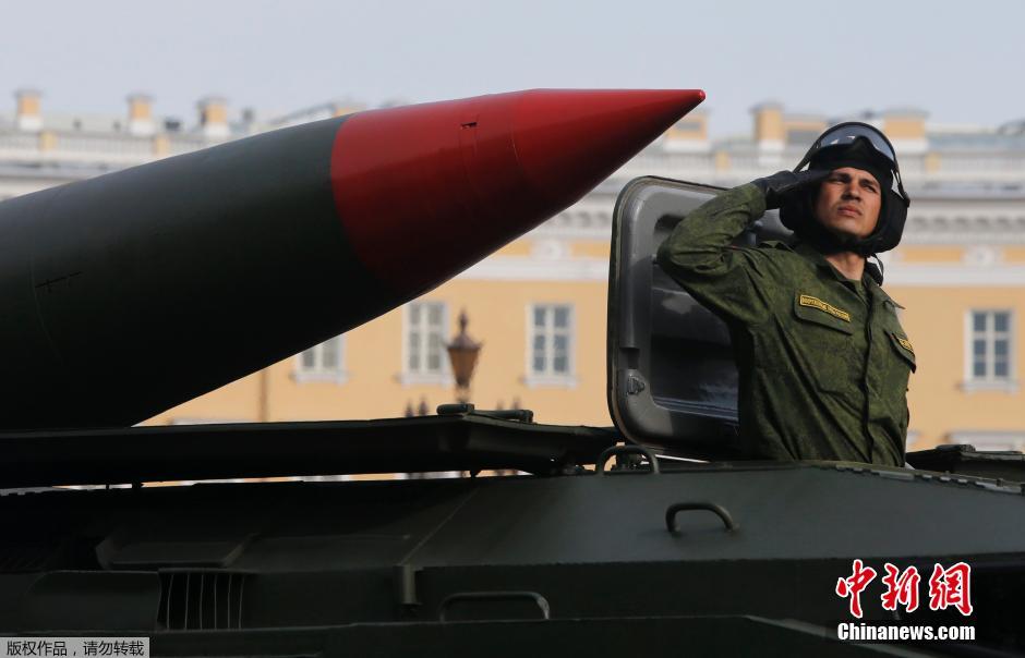 当地时间2014年4月28日,俄罗斯圣彼得堡,俄罗斯军队在广场举行5月9日胜利日阅兵彩排活动。
