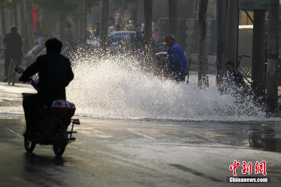 5月1日,河南郑州康复前街一处自来水管爆裂,强大的压力使自来水从窑井盖下喷涌而出形成巨型水柱,道路上已成小河。据自来水公司现场抢修人员介绍,目前原因还不清楚,现在只能先关闭一个控制的总阀门,然后再进一步查明原因,初步估计该自来水阀门附近民众的生活用水都会受到影响。中新社发 王中举 摄