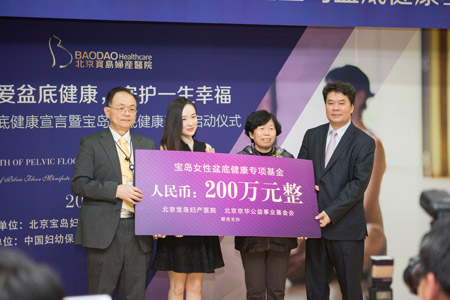 “女性盆底健康宣言暨宝岛女性盆底健康基金启动仪式”26日在京举行。中国妇幼保健协会办公室主任宋世琴教授、北京京华公益事业基金会理事长郑武、北京宝岛妇产医院院长余坚忍、北京宝岛妇产医院董事长杨文秀等出席了启动仪式。演员霍思燕应邀出席,作为“宝岛妇女盆底健康运动”明星推广大使,为全面推广“宝岛妇女盆底健康运动”拉开序幕。图为宝岛女性盆底健康基金启动。