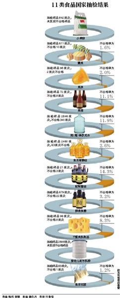 新京报讯 我国已确立食品安全国家监督抽检制度和抽检结果定期公布制度。昨日,国家食品药品监管总局首次发布小麦粉、乳制品、食用油等11大类食品安全状况的国家监督抽检结果,瓶(桶)装水、果酒、配制酱油不合格率超过10%。