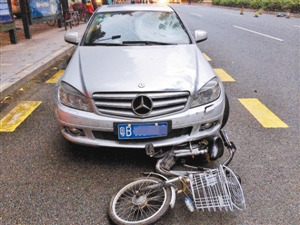 4时10分许,单独骑行在后方的张女士被一辆飞驰而来的奔驰车撞飞。张女士的同事常女士回忆,当时她与另一名同事并排走在前面,突然听到后方传来一声巨响,回头一看,张女士已经不见了踪影。“我当时心里一凉,坏了,张姐被那辆车撞了。可那辆车撞到张姐以后并没有停下,而是直接转向了最左边的车道,我们便不停地大喊‘救命!救命!’。司机可能是听到我们呼喊,慢慢把车才停下来,开到了最右边的公交站台旁边。”