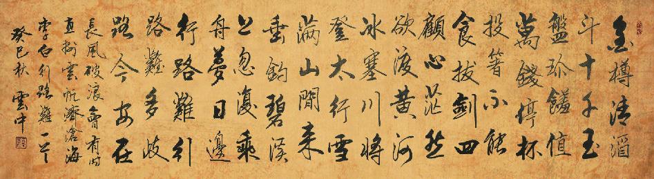 其次,他范修百科,品行为先。他常讲:书法是表现人的艺术,字如其人有着广泛的共识。书法是线条艺术的表现形式。同时,它又像一件精美的百宝箱,里面可融进无限耀眼的百科明珠,你给它装的越多,它越辉煌。它即表现着国人的智慧,又表现着一个书法家的素质和涵养。强调书法家必须要懂得文字,单一的线条没有深厚的知识面来支撑就不会发展,就很难达到书法艺术的高度。人有丰富的知识面,字就有其它的多元性。有背景、有感情、有立场、有个性。欣赏他就像与名流贤达对话,对人有极深的感染力,黑白布局有其哲理性;点画运行有其音乐舞蹈的表现力;结构章法有其神圣的尊贵性。如此等等都来源于书法者的综合素养。吸收的知识能量少了,就不能放射出完美的、耐人寻味的好作品。他在谈创作意境时感受到:“兴来挥毫染春风,竹影云淡织罗绫。为使激情放光华,心在霜地落清印。伏案挖出金沙粒,砚田抽得甘味浓。竹管毫影千万色,香堂垂媚醉墨人”。“天朗气清书兴佳,细品兰亭有大雅。日光催人开奇境,墨香染得醉意发。粒粒珍珠串诗文,提摁洒落成点划。此时不愿做凡客,心手自然绘奇画”。