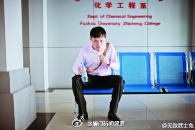 博主“无敌武士兔”告诉记者,照片里的这对新人,新娘是福州人,新郎是江西人,当天他担任这对新人的婚礼摄影师。据他介绍,婚礼于上月12日举行,刚好撞上新娘的考研复试(第二轮笔试),新娘中午化完妆,举行了婚礼仪式,下午就赶去考点,参加了考试。新娘在新郎陪伴下赶考的一幕幕,被“无敌武士兔”用镜头记录下。其中一张照片里,新郎坐在考场外,正在啃面包。“无敌武士兔”说,为送新娘赶考,新郎顾不上吃午餐,将新娘送入考场后,就在考场外,就着一瓶矿泉水吃了点面包。