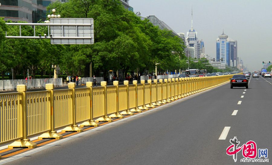 长安街沿线换上金黄色的新护栏,干净亮丽,庄严大气。