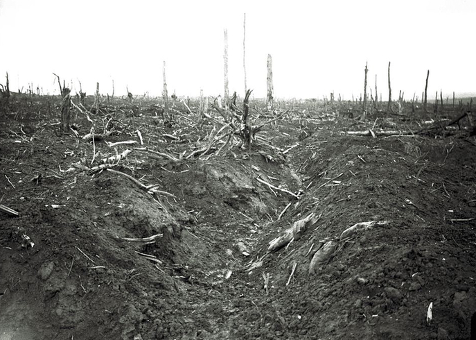 1916年9月份,在索姆河附近戴尔维尔森林中,被炮火毁掉的废弃战壕。麦卡林说:“看看这只有月球上能看到的场景,破坏严重,好像没什么东西能再生长。我所经历的战场中,只有1968年年越南春节攻势能与此相比。当时美军对越南顺化(Hue)发动炮击和空袭,当攻击结束时,那里变成一片废墟。”
