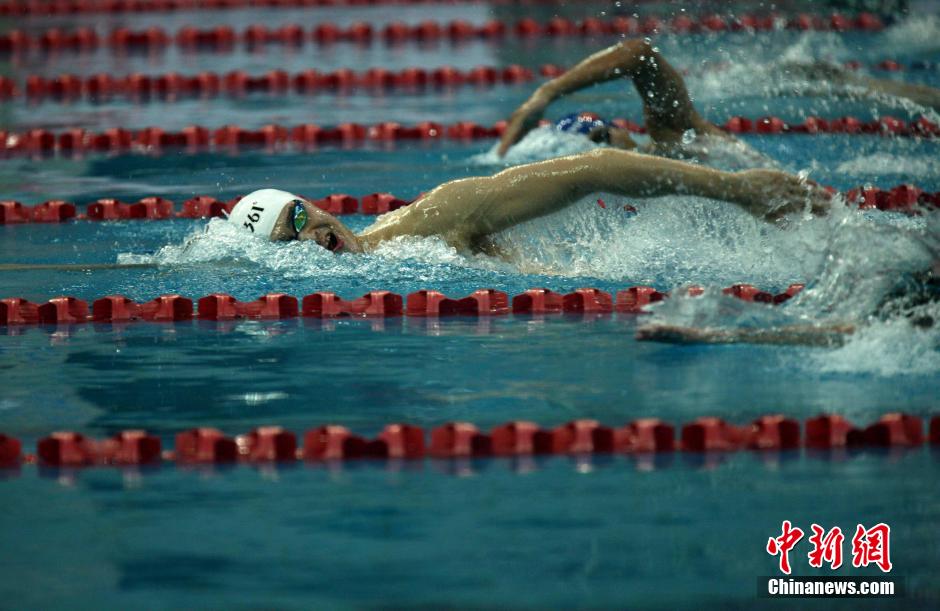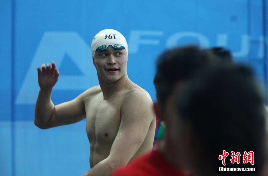 5月12日上午,中国男子泳坛领军人物孙杨亮相青岛体育中心国信游泳馆,参加2014年中国游泳冠军赛暨仁川亚运会选拔赛预赛。据悉,孙杨将参加男子200米和400米自由泳比赛,而其主项1500米则极有可能“选择性放弃”。从去年11月起,孙杨就因无证驾驶事件遭到停训、停赛、停止一切商业活动的“三停”处罚。上月末,孙杨 “解禁”, 复出后首战青岛。中新社发 徐崇德 摄