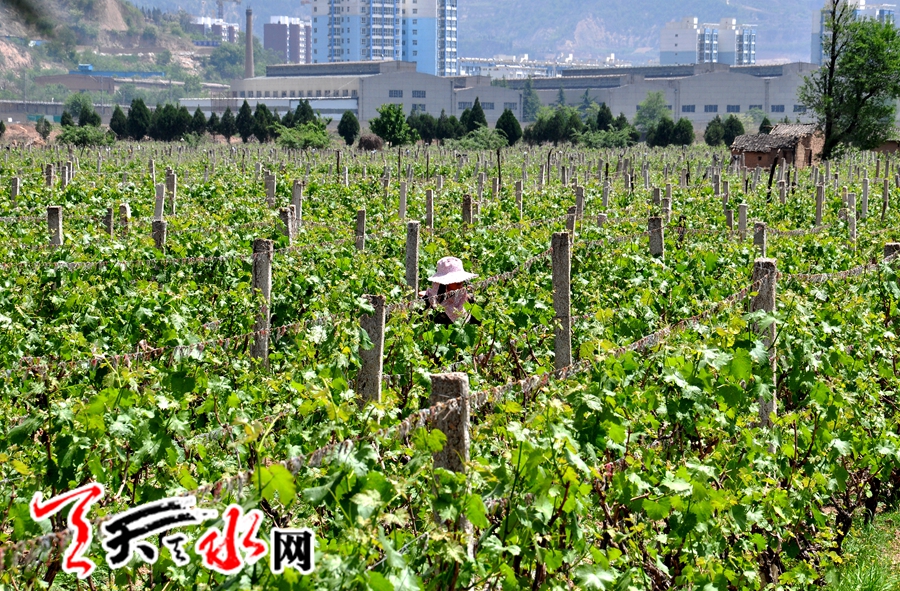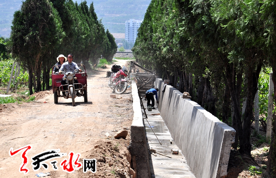 天天天水网讯(记者 何永德) 5月10日,麦积区花牛镇峡口村王姓村民正在给种植的葡萄喷洒农药,与此同时,一条长1500米、宽2.5米的排洪渠正在与她耕地相临的村道旁加紧修建当中。