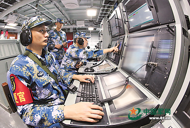 专业舱室内,官兵严阵以待。