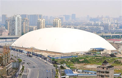 杭州市区三里亭小区的一个巨型充气帐篷引来了过路人好奇的目光。帐篷高达36米,占地约2万平米,远远望去好像一个白色巨堡。据悉,充气帐篷所在的地块曾是杭州农药厂,厂区搬迁后土地就一直闲置着,在上面搭建帐篷,是为了防止异味扩散。