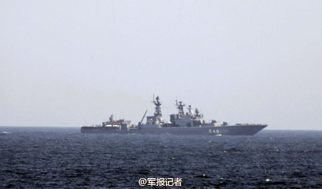 5月23日上午9时许,联合护航课目演练在某海域展开,俄海军097船模拟被护船只,中俄海军两个舰艇编队各自单纵队,分列被护船只两侧。期间,还组织郑州舰和瓦良格号舰载直升机起飞、互降。记者尹航摄