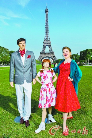 两个人的“结婚照”拍摄于一座白色的建筑物前。海因茨身着婚纱,手挽着帅气的“丈夫”,一脸幸福满溢。在“度假”照片里,海因茨多了一个扎着两条小辫,身着花裙子的“女儿”。“一家三口”穿着优雅,在埃菲尔铁塔前留影。