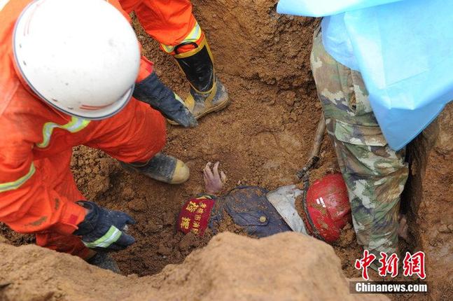 2014年5月26日10时17分,湖北省孝感安陆市发展二路安能电厂旁城市道路改造工地发生坍塌,1名施工人员被埋压。接警后,孝感市公安消防支队迅速调集安陆中队现场施救,在抬送被困工人过程中,中队长卢亮和战士万京燕、孙雨豪及被救工人(卓进波,男,46岁,湖北孝感安陆市接官乡五组村民)被突然发生的大面积塌方埋压。经全力搜救,被埋压4人于16:37分救出,己全部遇难。图为中队长卢亮至死都保持着救人的姿势。文字来源:荆楚网 武林 摄 图片来源:CFP视觉中国