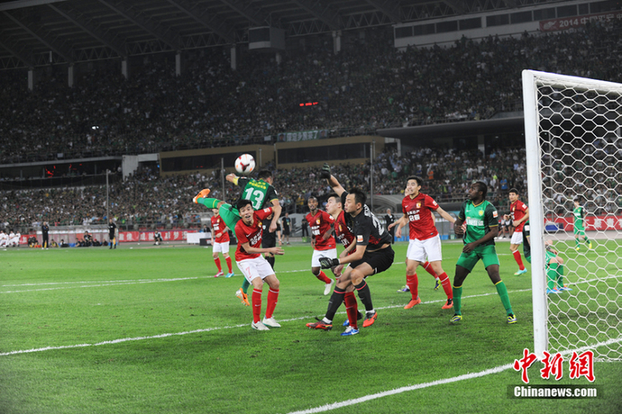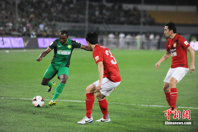 5月26日晚,中超联赛第14轮上演最后一场争夺,在这场关系到积分榜榜首归属的焦点之战中,北京国安队主场1比1战平广州恒大队。本轮过后,双方在积分榜上各添1分,国安依然以1分之差落后恒大,暂列积分榜次席,恒大则以32分继续领跑。中新网记者 田博川 摄