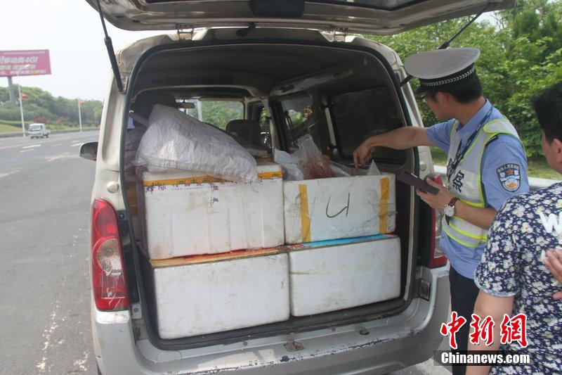 5月27日上午,江西吉安,江西高速交警在樟吉高速吉安南收费站执勤时,截获一辆用泡沫箱装载的200多只人体胎盘河南牌照的面包车。张荣 摄 图片来源:CFP视觉中国