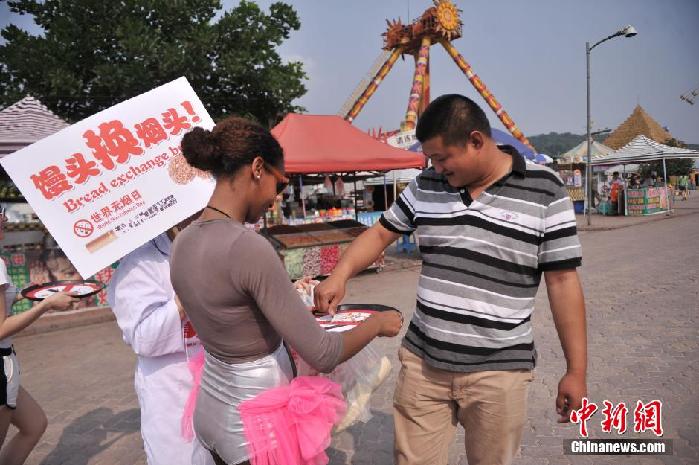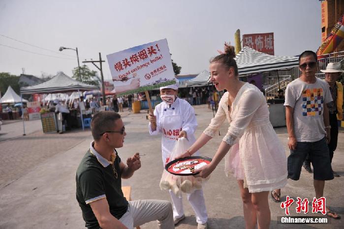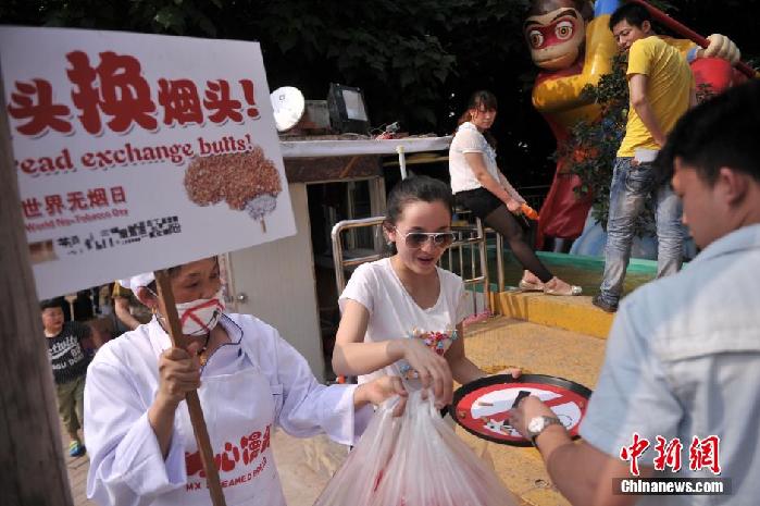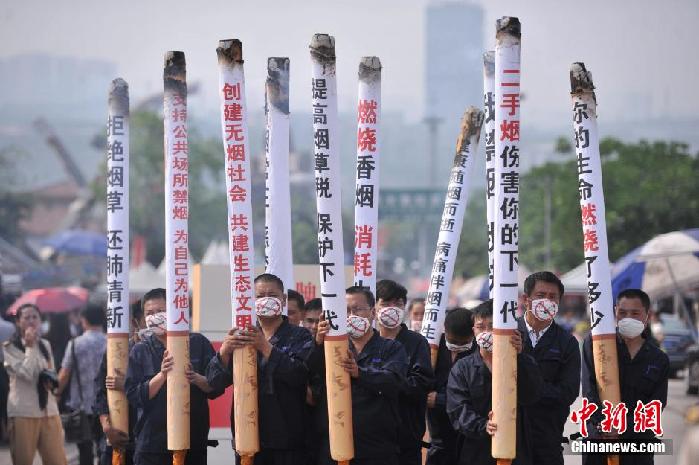 5月30日,重庆洋人街志愿者举着巨型香烟和灭烟托盘提醒市民吸烟有害健康。为呼吁市民创建无烟社会,洋人街工作人员扛着10余支长有近3米,写着“创建无烟社会共建生态文明”、“拒绝烟草还肺清新”、“燃烧香烟消耗生命”等的巨型香烟,并主动要求在街头抽烟的游客灭掉手中的香烟,只要配合灭烟的可获赠一景区自产的特色馒头。