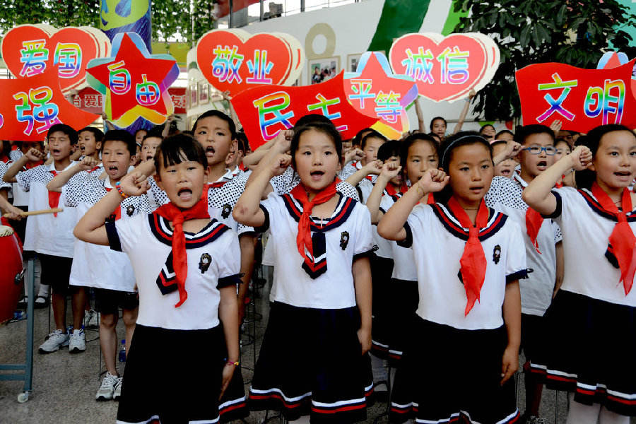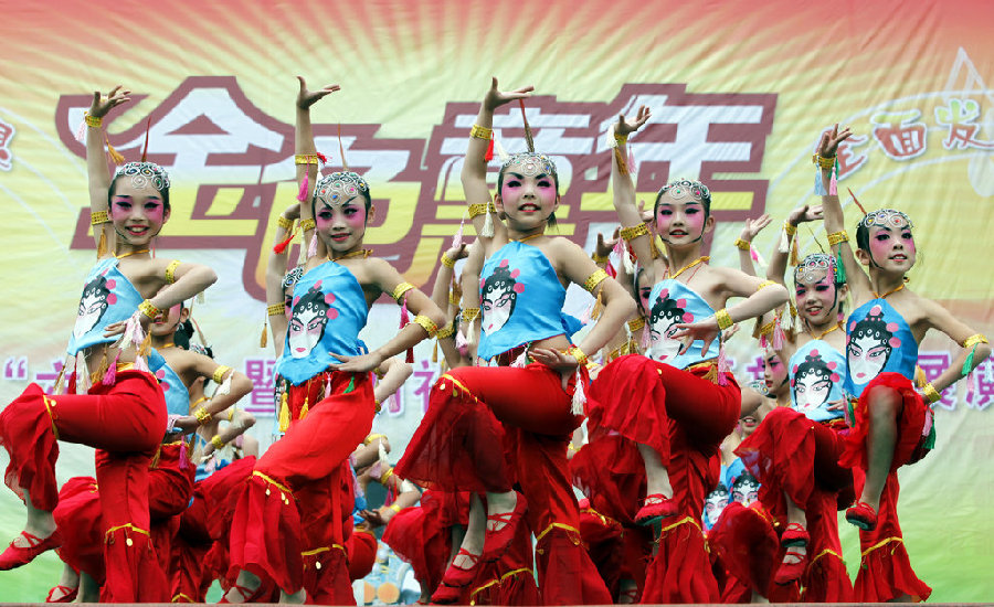2014年5月30日,重庆云阳县民德小学学生表演川剧脸谱庆祝“六一”国际儿童节。