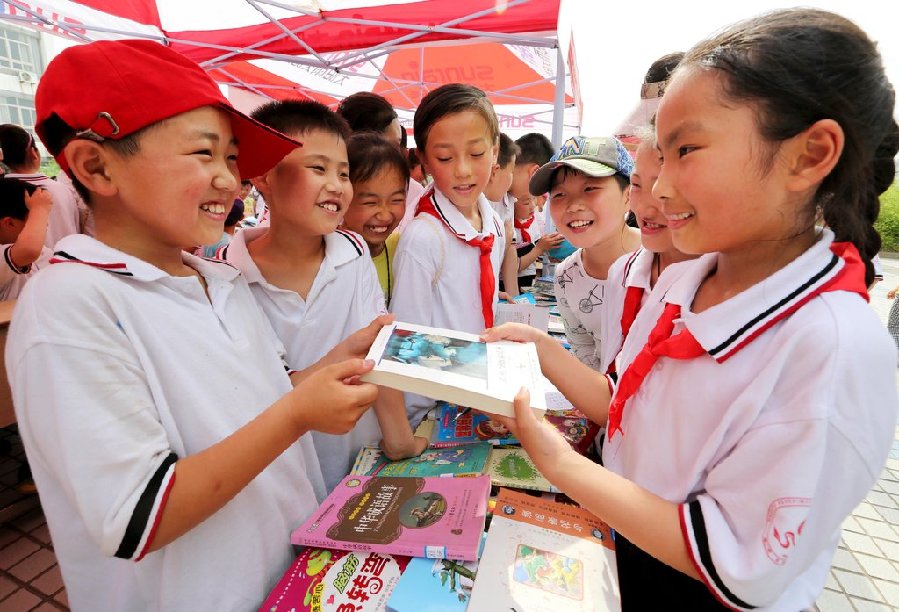 2014年5月30日,连云港市海州实验小学的学生们在校园图书跳蚤市场上交换图书。