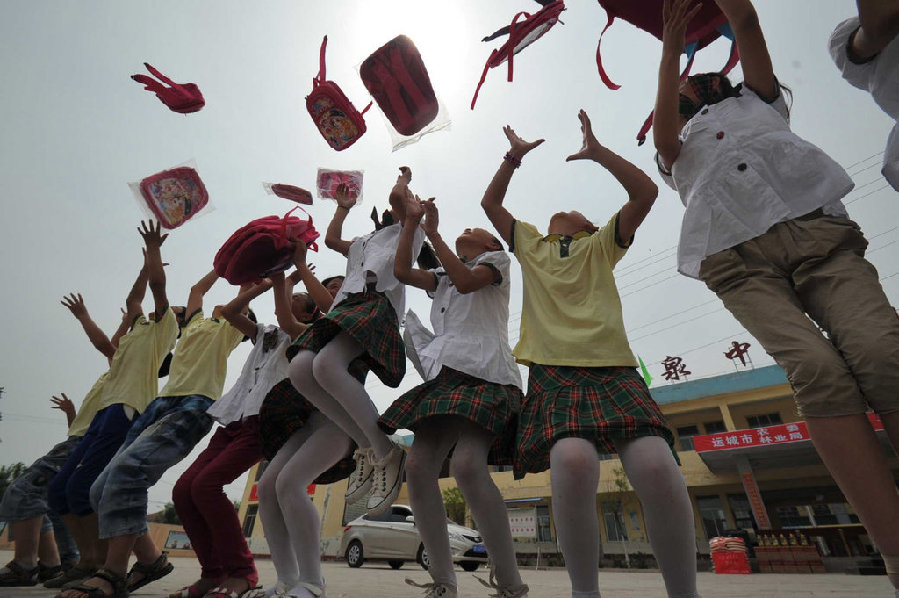 2014年5月30日,领到爱心书包的山西运城市新绛县开发区柳泉中心小学的留守儿童们在欢呼雀跃。