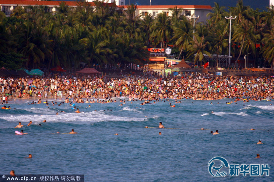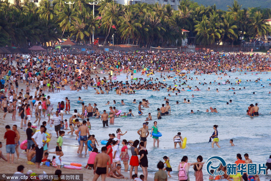 2014年6月2日,海南省三亚市,端午节当天,上万名市民及游客踊到大东海洗龙水,热热闹闹过端午节。上万市民及游客洗龙水。图片来源:东方ic