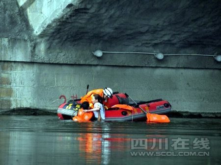 为尽快将轻生女子救上来,现场指挥员迅速部署救援方案:一组官兵佩戴好个人防护装具站在桥上对女子进行劝解,让其放弃轻生念头,同时找准时机将女子抱上来;另一组官兵穿戴好救生衣利用橡皮艇下至河面,划到女子的下方,做好女子跌入河中第一时间救援准备。时间一分一秒的过去,就在救援人员进行劝解的同时,轻生女子突然做出了一个危险的动作,离开了所坐的电缆上,身体垂直双手拉着铁管跳入河中。桥下的救援人员发现女子入水后,立即跳入河中拉住该女子,并一点点将女子托起扶到橡皮艇上。经过消防官兵的努力,轻生女子被成功营救上岸。