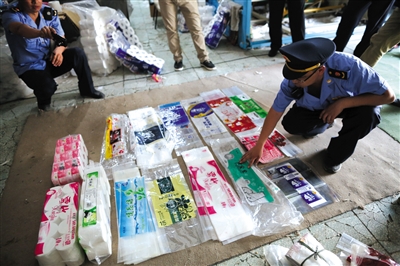 工商执法人员在清点涉案包装袋。昨日,大兴一生产假卫生纸的窝点被查处。