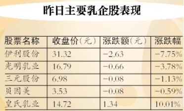 昨日为“乳企大考”发榜后的首个交易日,从股价表现来看,除皇氏乳业由于收购两家文化传媒公司开盘即涨停外,上市乳企出现普跌,贝因美、蒙牛乳业、三元股份、光明乳业、伊利股份等均出现不同程度的下跌,其中三元股份下跌1.13%,光明乳业下跌3.78%,伊利股份跌幅最大,下跌7.75%。