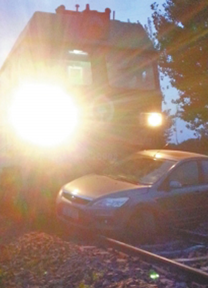 现场:火车把轿车顶出30多米远