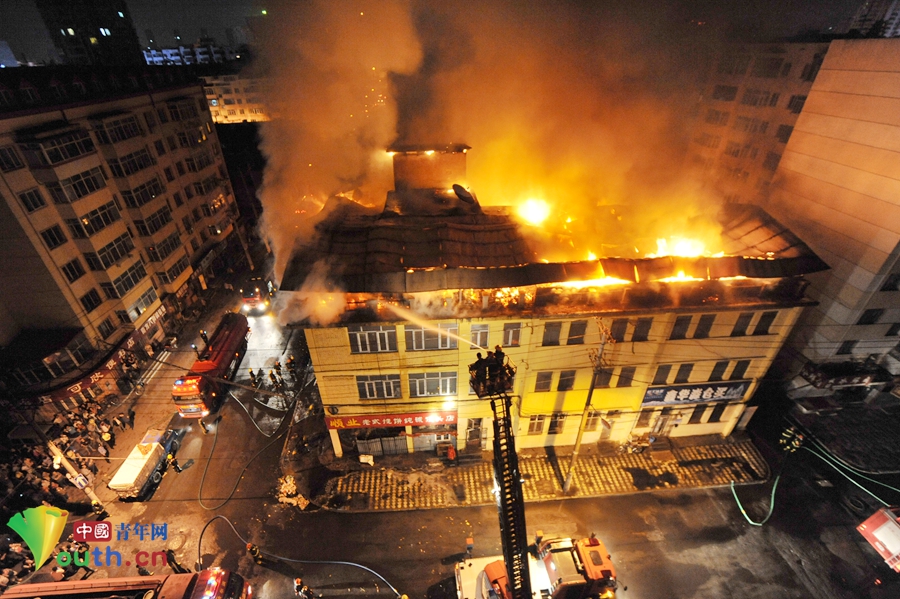 2014年6月10日22时10分许,哈尔滨市道外区道外北十二道街与钱塘街交叉口一处三层建筑起火。目前五支消防中队到场扑救。32米直臂云梯,56米及70米高喷车以及多台35吨大型水罐车都已到场。据悉,起火建筑系货仓,目前火势很大,不断有回火发生,消防战士使用云梯车登高从高处打水灭火。期间有一条牧羊犬从楼上坠落被市民救起,暂时没有人员被困的情况发生。