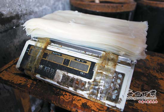 当日上午11时许,记者随执法人员穿过徐家湾一带众多正在拆迁的低矮房屋来到一个小院,院子的北侧是一排二层楼房,在一层的最西头,房屋铁门紧锁,然而透过窗户,可以看到里面放置着一摞摞用以制作酿皮用的铁锣,还有面粉等,并不见老板。据附近的居民讲,这里一般是晚上才加工制作酿皮,白天拉到市场上去卖,所以白天往往见不到人。