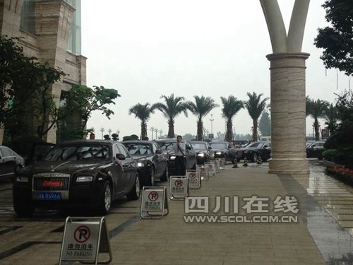 下午15时许,记者来到环球中心某五星级酒店,现场停放着8辆劳斯莱斯,头车是劳斯莱斯幻影,每辆车上有鲜花装扮。在婚礼现场,有铺着鲜花的小道、西式教堂风格……记者从新郎的亲戚处了解到,这些车不是租的,都是新郎、新娘以及他们父母向朋友借过来的。其中一辆劳斯莱斯的驾驶员说,他和新郎是朋友。另外一辆车的专职驾驶员则说,这车是他老板的,老板和新人是朋友,“新郎是开民营企业的。”该驾驶员告诉记者。