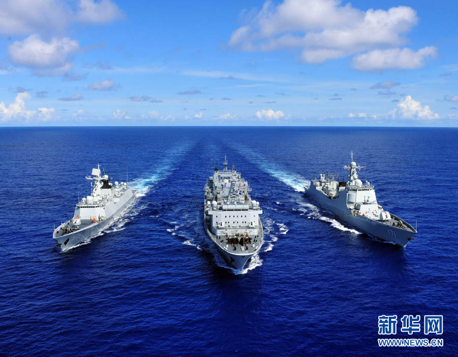 6月13日当地时间上午7时许,从三亚起航的海军赴美参加“环太平洋-2014”演习舰艇编队在西太平洋海域进行第一次航行补给。综合补给舰千岛湖舰为海口舰和岳阳舰补充燃油等物资。图为6月13日上午,综合补给舰千岛湖舰(中)与海口舰(右)和岳阳舰实施海上补给。胡锴冰 摄