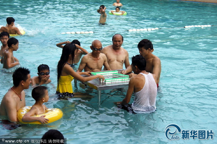 广东佛山游客游泳池中打麻将