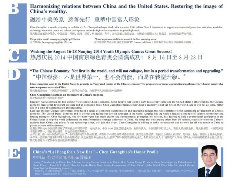 17日,陈光标在个人微博上发布了刊登广告的信息,注明“这次纽约时报彩色整版由标哥亲自设计”,并预告类似广告还将“于北京时间18日在《华尔街日报》登出”。