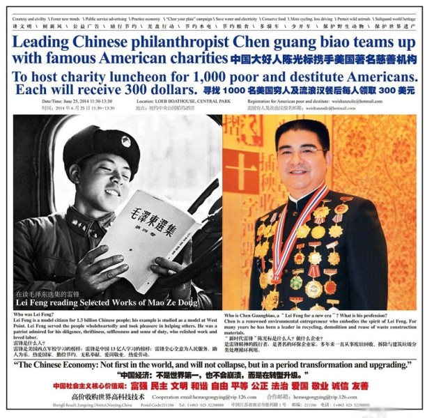 陈光标在美媒发广告 称要给美国穷人发钱