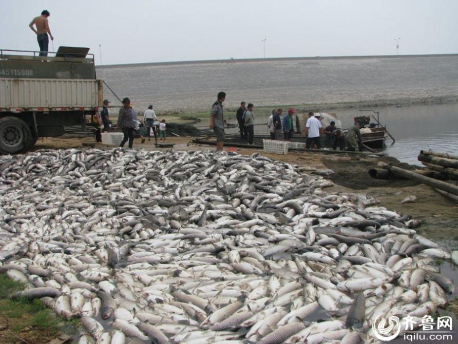 6月18日,山东临沂市费县大田庄乡上冶水库,10多万斤网箱养殖的草鱼、鲤鱼因天气闷热,养殖密度过大缺氧死亡。据不完全统计,大面积养殖鱼死亡给养殖户造成60万元损失。(齐鲁网记者 张伟 通讯员 王凤军 摄)图片来源:齐鲁网