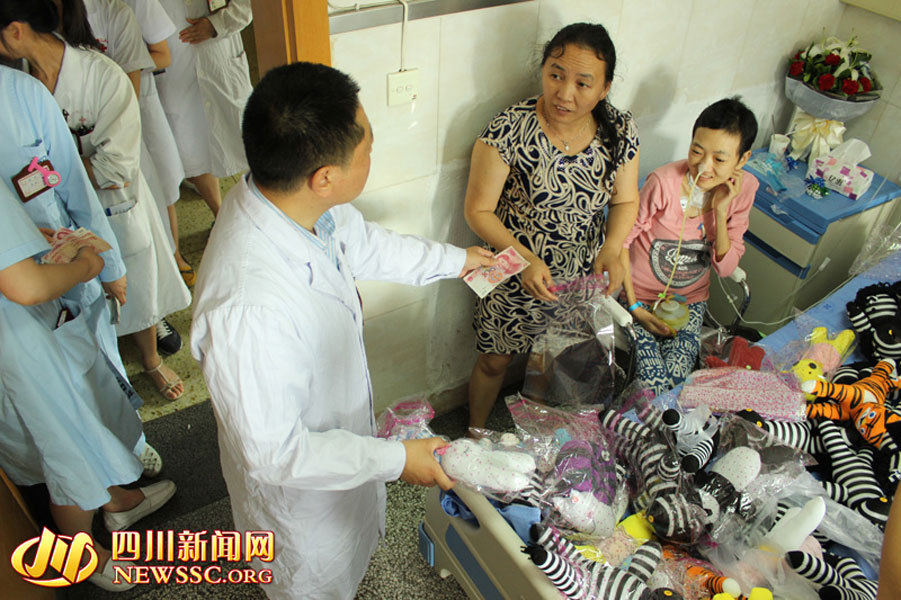 因为肠胃梗阻,长期无法进食,也无法排便,周洁只有靠胃肠减压管和输入营养液维持身体正常运转。 一周之前,周洁从成都军区总医院转到成都市二医院,医生诊断,癌细胞已经广泛扩散转移,情况不妙,已经不适合做化疗,只能转而采取保守疗法,开展积极的对症支持治疗。此前,周洁或多或少已经对自己的病情有所判断,可是她更希望奇迹发生。 今天,二医院肿瘤科的医务人员发起倡议,决定给周洁更多鼓励,于是在病房内自发购买她的布偶,老虎、兔子、斑马……医务人员用超出物品本身的价格,向周洁购买了几十个布偶,这让周洁感到十分欣慰,脸上又绽放出久违的笑容。