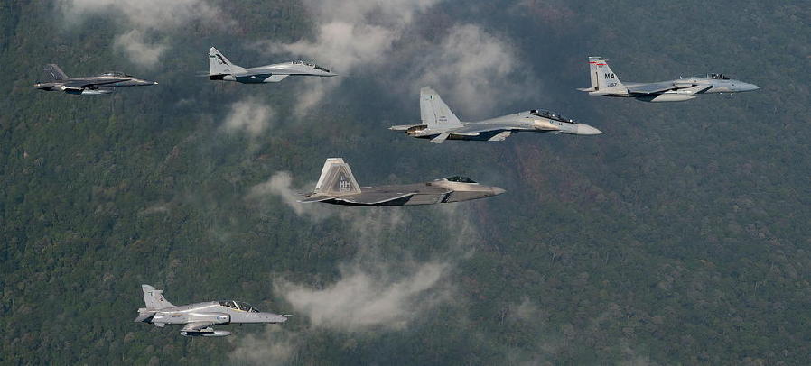 日前,在马来西亚参加美马“对抗台风2014”演习的两国空军多型战机集体出动,拍摄了空中“全家福”。其中今年有美军F-22战斗机首次赴东南亚参演,为“全家福”增色不少。马来西亚空军装备的机型非常杂,光主力战机就包括苏霍伊的苏30MKM、米高扬的米格29N、美国波音的F/A-18D三型,还有英国BAE的鹰式高级战斗/教练机。