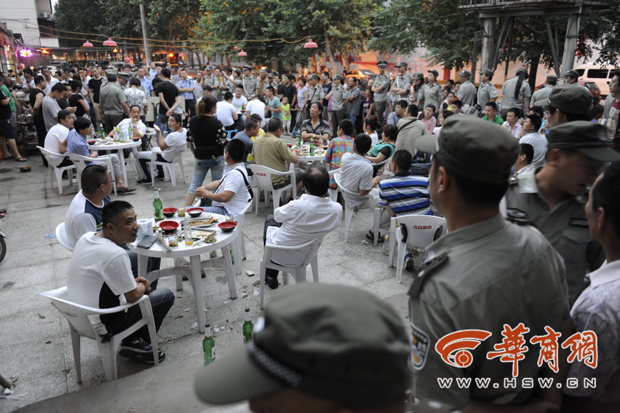 近50名城管没办法,只好围站在占道的烤肉摊前。一名负责此次整治行动的负责人只好弯下腰,拍着食客的肩膀好声相劝:“朋友,你看我们执法也不容易,占道经营是要整治的,要不影响了百姓出行。”该负责人很有耐心,“喝了这瓶酒你们回去洗个澡睡觉多舒服,在这里真没什么热闹看。”