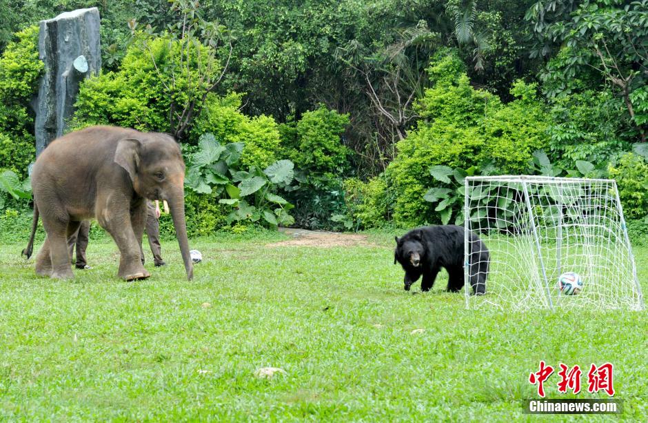 6月22日,广州长隆野生动物世界上演一场“动物世界杯”狂欢派对,大象点球黑熊守门,而大猩猩则争做“预测帝”,预测23日凌晨开展的葡美大战,动物们的表演为游客带来不少笑声。中新社发 刘卫勇 摄