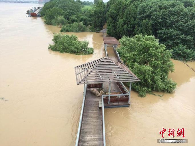 一星期内接连的暴雨天气,导致浙江兰溪兰江超警戒水位,于6月23日凌晨2时40分达到31.76米,部分街道被淹。据兰溪水文局最新消息,由于昨晚上游流域平均降雨48毫米,兰江水位将回涨,预计今晚22时达到洪峰水位32.2米。图为兰溪江心岛被淹,岛内公园里的骆驼被困在洪水中。中新社发 奚金燕 摄