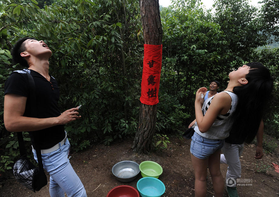 湖北通山4棵松树晴天滴水 村民游客争相抢水喝